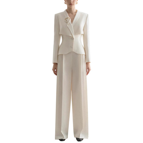 ชุดสูทสองชิ้นสำหรับทำงานมีสไตล์แจ็กเก็ตเอวโซ่กางเกงขากว้าง