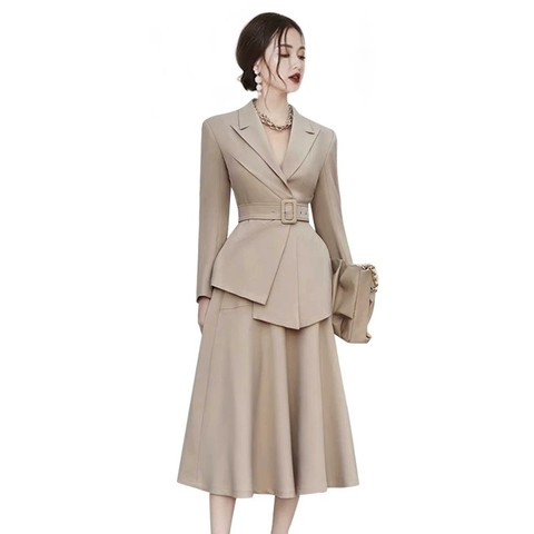 ชุดสูทกระโปรงสองชิ้นเอวสูงแบบไม่รัดเอวเข็มขัดแบบไม่สม่ำเสมอชุดเสื้อผ้าแฟชั่นเอวสูงสำหรับฤดูใบไม้ร่วงใหม่2025