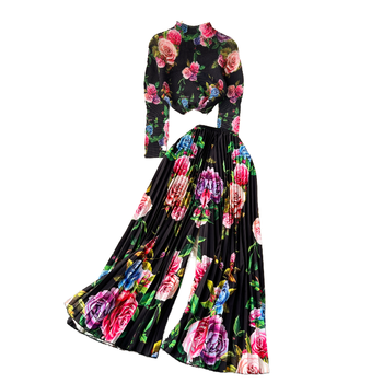 ชุดเสื้อผ้าสำหรับฤดูใบไม้ผลิ/ฤดูร้อนเสื้อพิมพ์ลายจับจีบแขนยาวหรูหราขนาดเสื้อและ XS กางเกงสองชิ้น
